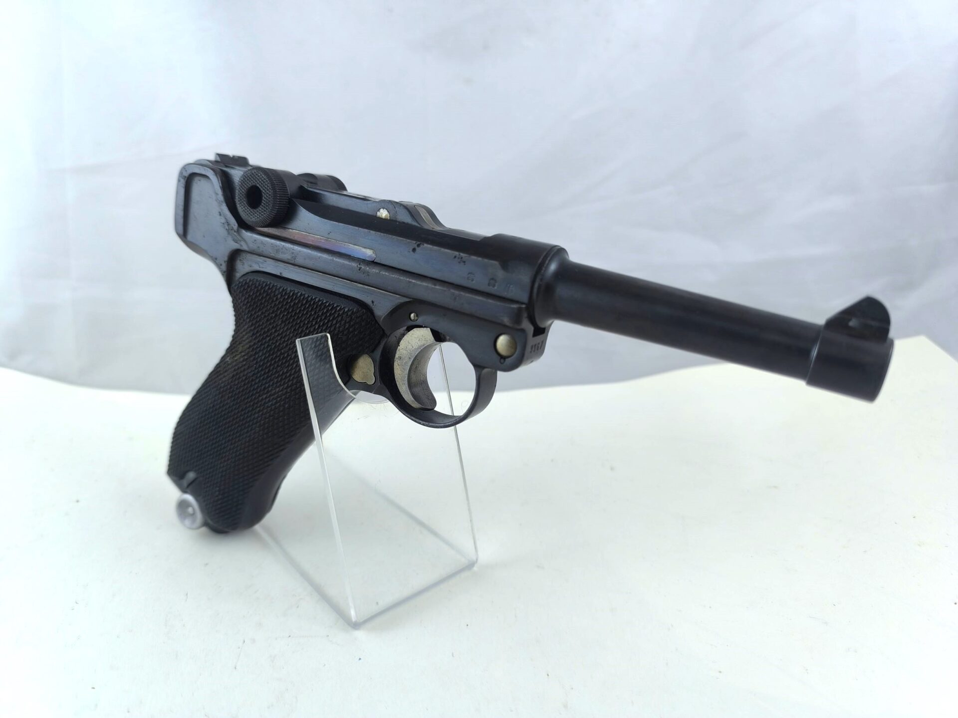 Pistolet Mauser P08 S/42 G kal. 9mmP został wyprodukowany przez firmę Mauser na potrzeby armii niemieckiej. Litera „G” nad komorą oznacza rok produkcji (1935), gdyż w tym okresie Niemcy nadal starały się ukrywać zarówno producenta, jak i datę produkcji.